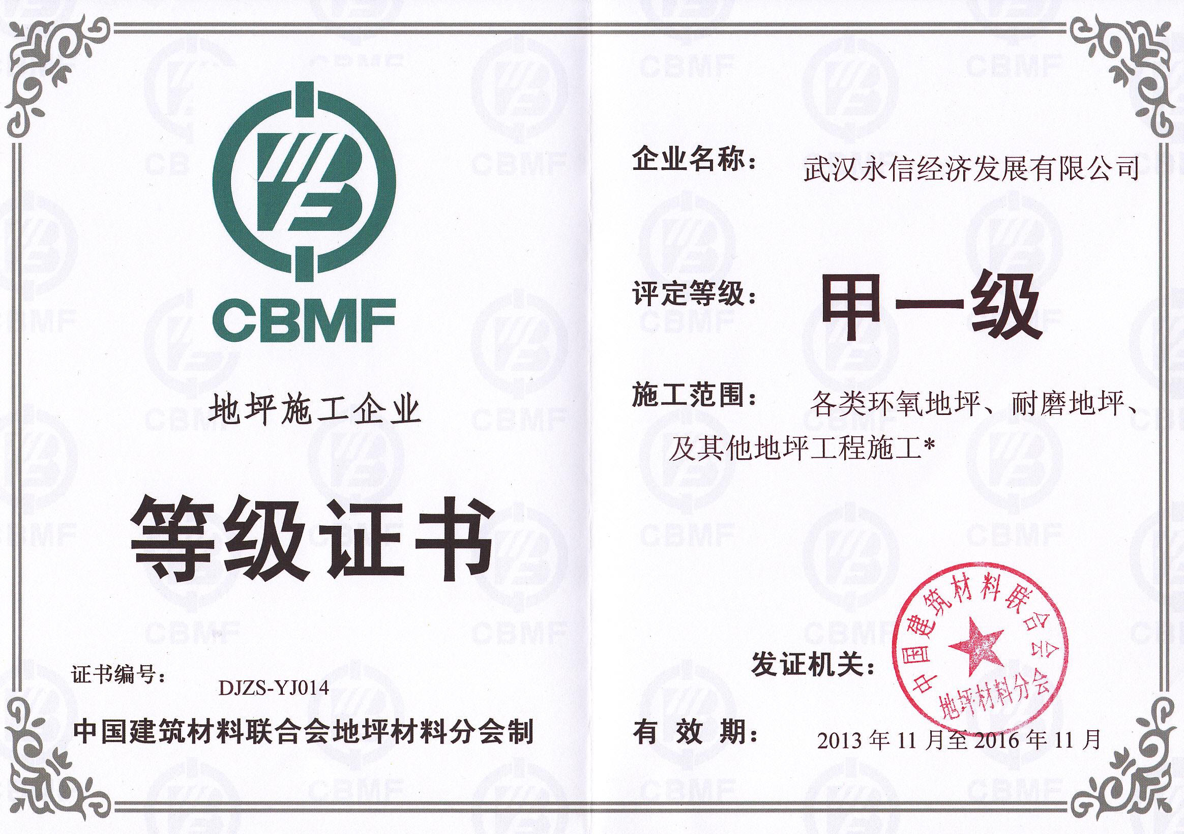 在公司領導帶領和正確指導下,經(jīng)公司全體員工共同努力,我司先進的施工工藝和優(yōu)質工程成果,榮獲中國建筑材料聯(lián)合會地坪材料協(xié)會頒發(fā)的“甲一級”證書。讓永信以更完美的姿態(tài)迎接地坪行業(yè)領域日新月異的挑戰(zhàn)。