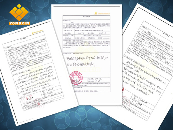隨著地坪種類的不斷豐富,應用領(lǐng)域的不斷擴大,地坪工程質(zhì)量已經(jīng)成為地坪行業(yè)持續(xù)發(fā)展的關(guān)鍵。一個優(yōu)質(zhì)的地坪工程產(chǎn)品,不再僅僅是面層材料選用和施工,更重要的是地面整體系統(tǒng),即面層+基層的整體方案設計與施工。武漢永信地坪用多年的經(jīng)驗和口碑得到了客戶的認可、得到了中國建筑材料聯(lián)合會地坪分會的官方認證。武漢永信將繼續(xù)致力于引進更加綠色、節(jié)能環(huán)保的新型建材,用我們自己的 產(chǎn)品為我們代言!