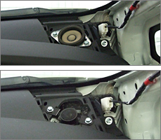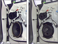 ●フロントドアに裝著したエンクロージュア一體型ウーファー(寫真右)。不快な共振を抑えたクリアな中低音です。