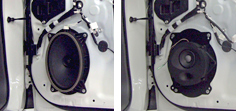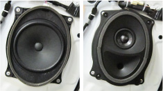 左:安裝在前門(mén)的原裝中低音揚(yáng)聲器示例 右:SonicPLUS豐田車(chē)專(zhuān)用中低音揚(yáng)聲器安裝示例(照片為T(mén)300系列)