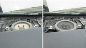 30系プリウスの純正ダッシュボードスピーカー(寫(xiě)真左)と、3C-P30L Triple Crestの52mm ARMSモジュール取り付け後(寫(xiě)真右)の比較。ボルトオン&カプラーオンで取り付けられ、車(chē)両への加工は一切不要です。