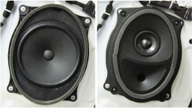 左:背面開(kāi)放的普通原車(chē)?yán)龋ǜ拍钫f(shuō)明圖) 右:采用全封閉方式的豐田車(chē)專(zhuān)用機(jī)型的前聲場(chǎng)中低音揚(yáng)聲器(圖片為T(mén)300系列用)