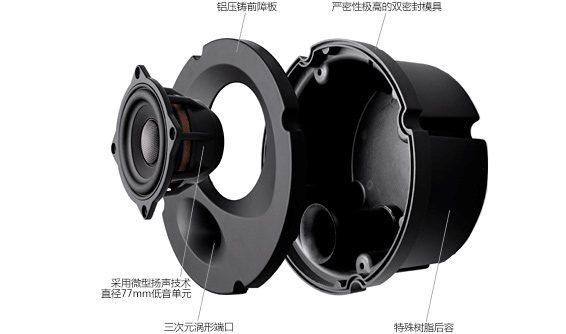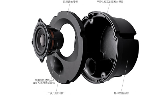 超出級(jí)別還原準(zhǔn)確豐富的信息量。DMF振膜和窄間隙電磁系統(tǒng)所組成的77mm中低音揚(yáng)聲器單元